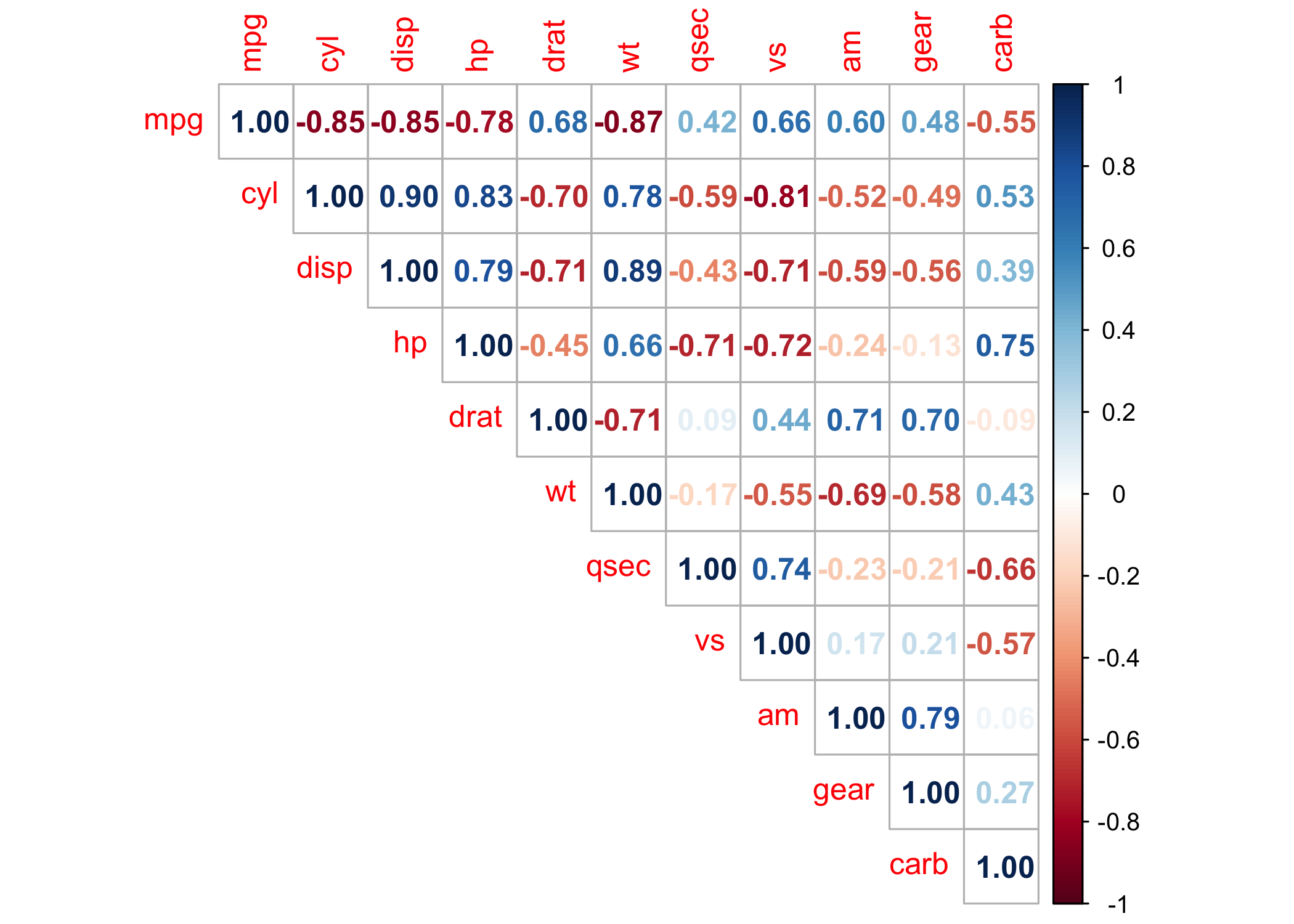 7. Qsec | 0.42* | -0.59*** | -0.43* | -0.71*** | 0.09 | -0.17 | - | ||||