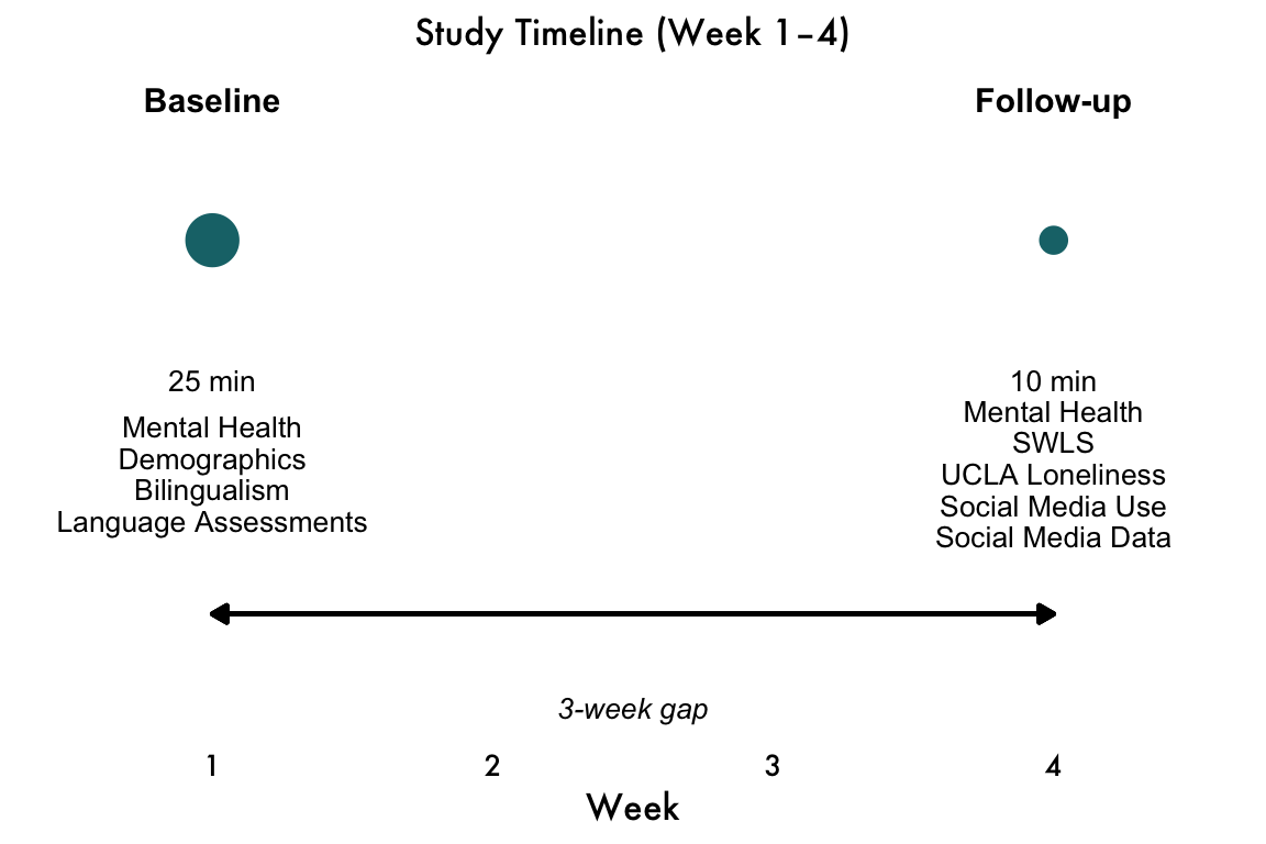 Description - Two-session online longitudinal study. - Baseline: open-text responses about mood, motivation, sleep (≈25 min) + GAD-7 + PHQ-8. - Follow-up (3 weeks later): repeat assessments (≈10 min) and collect information on posts from social media.
