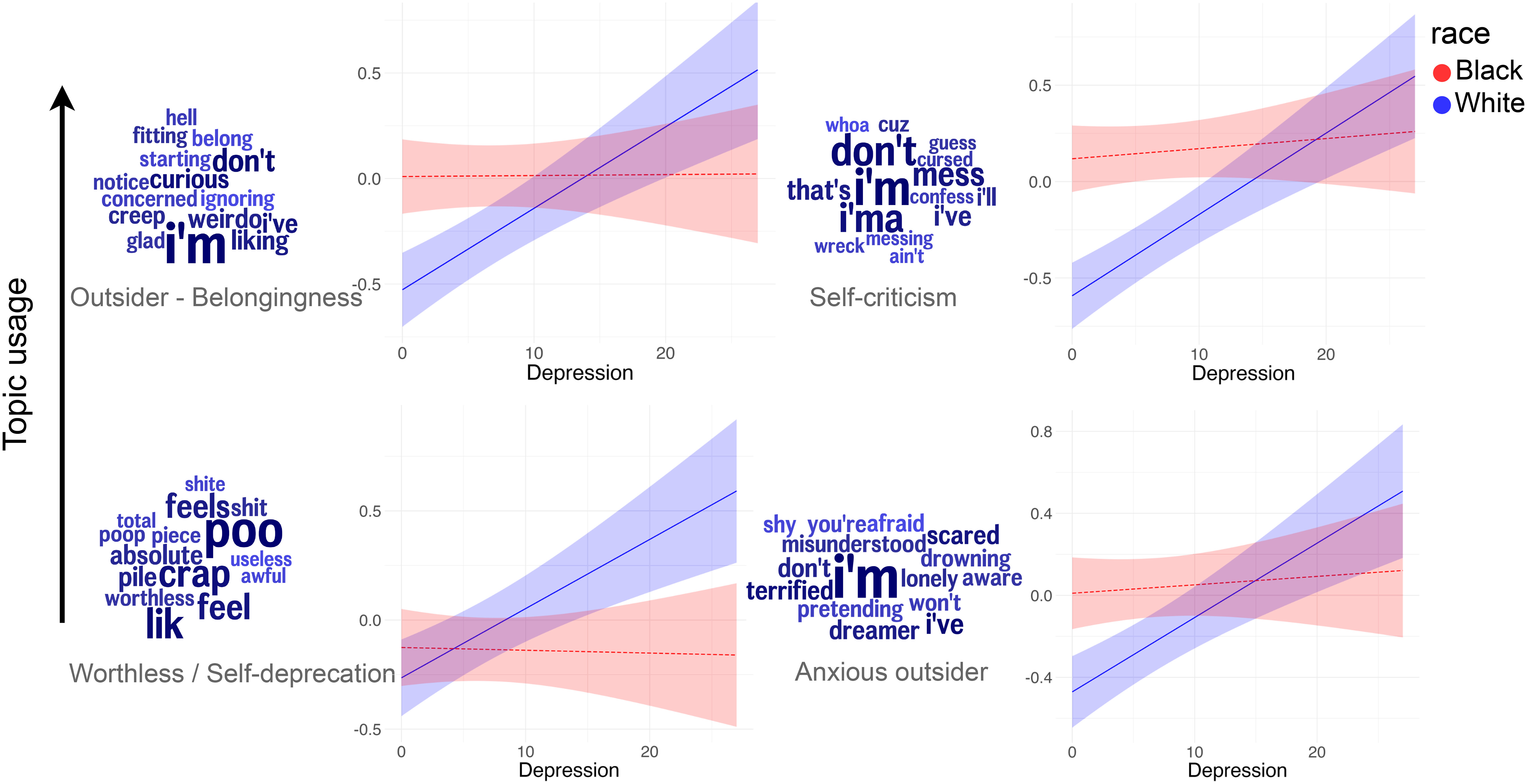 lm(symptoms ~ race * ling_feat, data = data)Goal: Exploratory/descriptive identification of linguistic markers of mental illness in minority groups.